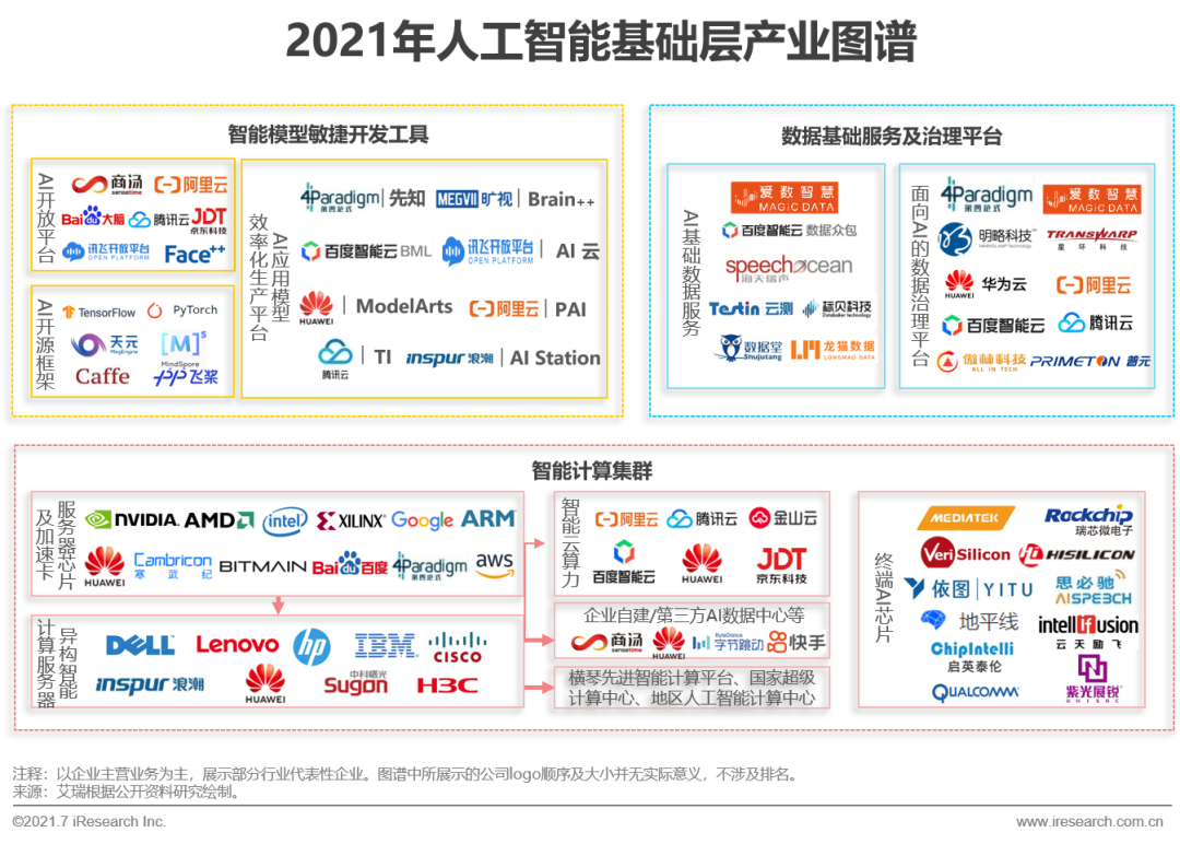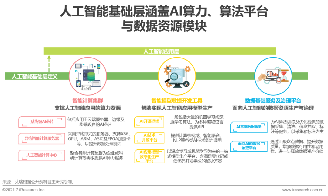 算力、算法、數據是人工智能產業發展的三大要素。據此,人工智能基礎層主要包括智能計算集群、智能模型敏捷開發工具、數據基礎服務與治理平臺三個模塊。智能計算集群提供支撐AI模型開發、訓練或推理的算力資源,包括系統級AI芯片和異構智能計算服務器,以及下游的人工智能計算中心等;智能模型敏捷開發工具模塊主要實現AI應用模型的生產,包括開源算法框架,提供語音、圖像等AI技術能力調用的AI開放平臺和AI應用模型效率化生產平臺;數據基礎服務與治理平臺模塊則實現AI應用所需的數據資源生產與治理,提供AI基礎數據服務及面向AI的數據治理平臺。AI基礎層企業通過提供AI算力、開發工具或數據資源助力人工智能應用在各行業領域、各應用場景落地,支撐人工智能產業健康穩定發展。