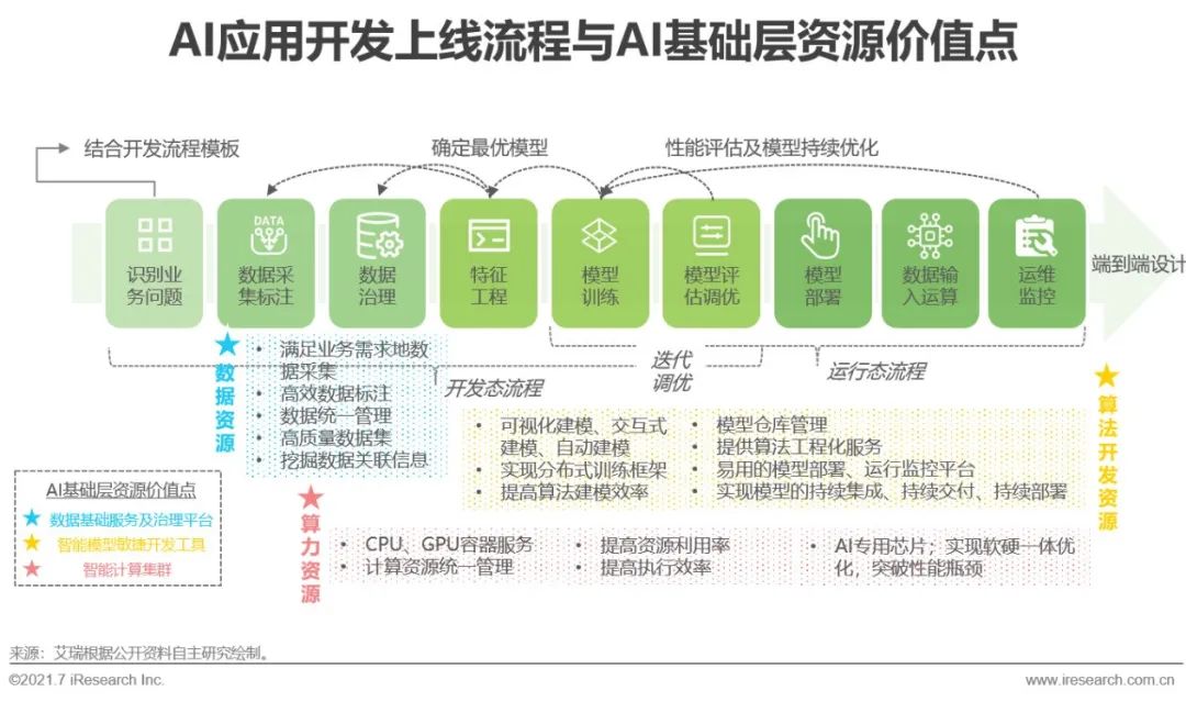 開發一項人工智能模型并上線應用大致需經歷從業務理解、數據采標及處理、模型訓練與測試到運維監控等一系列流程。過程中需要大量的AI算力、高質量數據源、AI應用算法研發及AI技術人員的支持,但大部分中小企業用戶并不具備在“算力、數據、算法”三維度從0到1部署的能力,而財力雄厚的大型企業亦需高性價比的AI開發部署方案。依靠AI基礎層資源,需求企業可降低資源浪費情況、規避試錯成本、提高部署應用速度。作為支撐AI模型開發及落地的必要資源,AI基礎層可在多環節提效AI技術價值的釋放;其工具屬性也標志著AI產業社會化分工的出現,AI產業正逐步進入低技術門檻、低部署成本、各產業深度參與雙向共建的效率化生產階段。