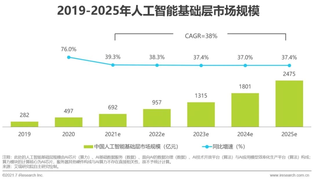AI企業突破業務增長瓶頸的需求是人工智能基礎層發展的驅動力之一。當前人工智能核心產業規模保持線性增長態勢,且增速趨于平穩與常態化。為尋求產值增長突破點,AI企業發力探索開拓市場的有效手段。依托人工智能基礎層資源建設,AI企業可有效應對下游客戶的長尾應用需求,再將高頻應用轉化為新主營業務。此外“新基建”、半導體自主可控等相關政策扶持、傳統行業智能化轉型等因素也都在助推人工智能基礎層資源的發展。據艾瑞測算,2021-2025年,人工智能基礎層市場規模CAGR為38%,整體產業規模發展速度較快、空間較為廣闊,總體呈現持續增長的走勢。2020年,中國人工智能基礎層市場規模為497億元,為人工智能產業總規模的33%,市場規模相較去年同比增長76%,AI應用模型效率化生產平臺創收增長、AI芯片市場規模隨著云端訓練需求出現較高增長等是同比增速的主要拉動力;2021-2024年同比增速趨于平緩下降,市場開始恢復穩步增長態勢。到2025年,中國人工智能基礎層市場規模將達到2475億元,云端推理與端側推理芯片市場持續走高使得人工智能基礎層整體市場同比增速稍有抬升。