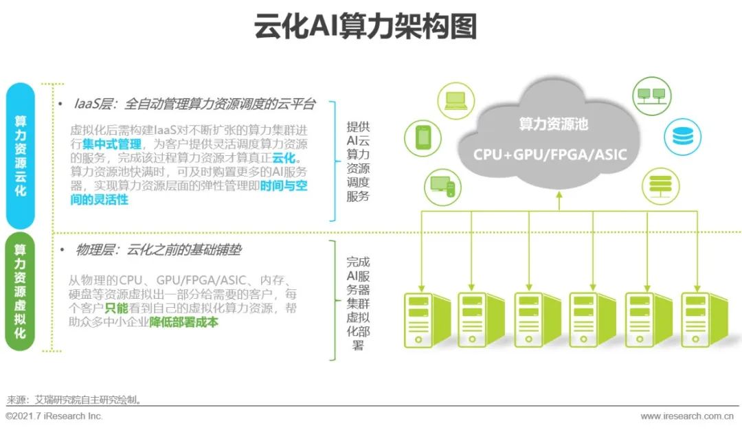 AI是一種高資源消耗、強計算的技術,AI算力的強弱直接關聯到AI模型訓練的精度與實時推理的結果。若企業獨立部署AI算力,不僅需要建設或租用機房這類重資產與網絡寬帶資源,還需要購置物理機、內存、硬盤等硬件設備,而且購置設備存在采購周期不確定、硬件資源過度鋪張、專業管理團隊缺乏等問題。所以,獨立部署AI算力資源是一項耗時耗力的工作。將AI算力云化是一種高效能、低成本的有力解決方案。具備先天性業務優勢的云服務商搭建數據中心,先將AI服務器算力資源虛擬化,開放給AI模型開發者,做到按需分配,如給短視頻業務的開發者優先配備CPU+GPU方案,而后對算力資源的調度工作進行統一管理。由此,“物美價廉”的算力有序注入各行各業的AI模型中,減輕了井噴式數據爆發所帶來的模型訓練負擔,并能及時根據用戶使用情況彈性擴充或縮減虛擬算力資源空間,達到方便、靈活、降本增效的效果。