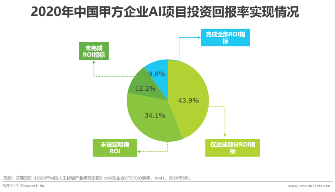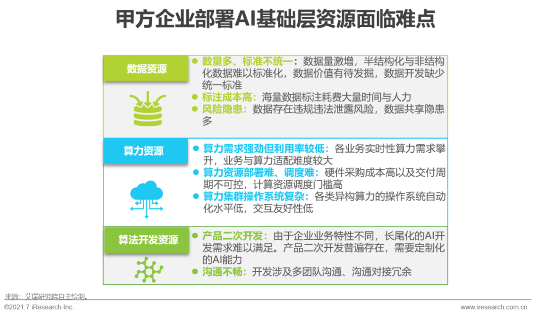 根據艾瑞2020年執行的CTO調研,2019年超過51%的樣本企業AI相關研發費用占總研發費用比重在10%以上,2020年65.9%的企業AI研發占比達到10%以上。一方面是甲方企業不斷增長的對智能化轉型的強勁需求,一方面則是在AI應用開發與部署過程中企業普遍面臨的數據質量(49%)、技術人才(51%)等基礎資源配置難點。且目前只有少數企業可以完成AI項目實施前設定的全部投資回報率(ROI)標準,因此甲方企業在投資AI項目時相對審慎。AI基礎層資源則可有效緩解甲方利用AI技術重塑自身業務時的投資矛盾,提升模型生產效率,降低部署成本:數據資源集群具備數據采標與數據治理能力,且一站式的數據平臺可對實時數據進行統一管理,提高數據利用率;高效的AI算力集群與調度系統可滿足模型訓練與推理需求,降低總擁有成本(TCO,TotalCost of Ownership);基于算法開發平臺演化出的語音識別、計算機視覺、機器學習等專業的AI模型生產平臺,可提供高效、一站式的AI模型生產服務。